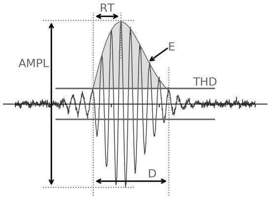 The post-processing of the recorded transients is done in real time in an additional module of the data acquisition software, which is coded in Python 3.7. Figure 1 shows a typical acoustic burst and some parameters that are also listed in Grosse and Ohtsu [17] and typically used for parameter-based analysis. The following parameters are calculated for each transient: