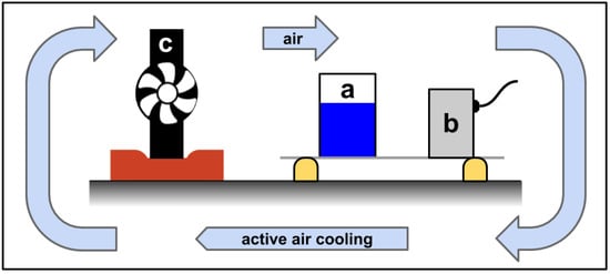 A sketch of the experimental setup inside the temperature-controlled box. An 1 mm thick aluminum plate is holding the sample of water (a) as well as the PZT sensor (b) and therefore couples the two acoustically. The internal van (c) ensures sufficient air movement and a uniform temperature inside the box.