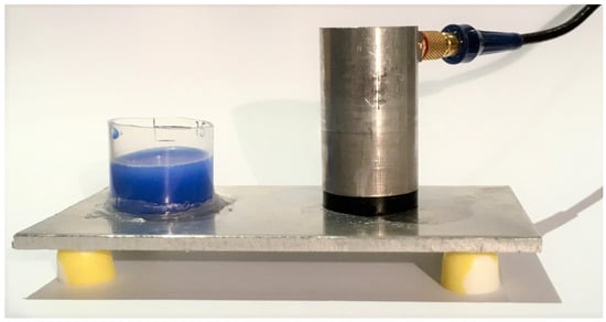 A photo of the sensor setup. The specimen and the PZT sensor are positioned on an aluminum plate which acts as a wave-guide. The plastic cylinder holds the water (for demonstration purposes colored in blue) and has no bottom so that the water is directly touching the aluminum plate.
