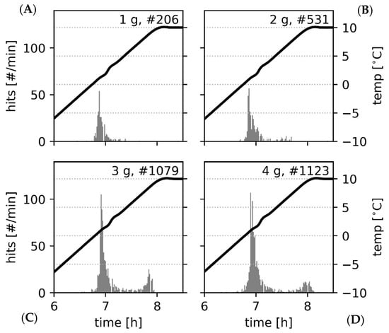 Time-dependent histogram of acoustic signals, “#hits” per minute, during the melting of ice. Four histograms (A–D) for four different amounts of ice ( = ( 1 , 2 , 3 , 4 ), upper left to lower right) plotted against the time (grey). On the second x-axis (right), the air temperature inside the experimental setup is plotted (black line).