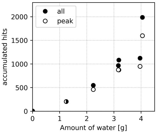 Figure 6 shows the acoustic activity during the melting of different samples with varying water quantities. The solid markers indicate the number of events measured during the complete melting process. As seen in Figure 4, the AE events in the initial melting phase dominate the total number of AE events. For the further analysis, the time between the two peaks divide the histograms in two parts (“first peak”, “second peak”). Besides all events (“all” = “first peak”+“second peak”), the number of events in the first peak (“peak”) are separately plotted in Figure 6 as circles. Only the missing “second peak” the measurement with the smallest quantity makes this distinction impossible and it is assumed that all AE events are in the “first peak”.