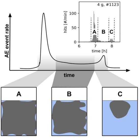 In Figure 7 a schematic, simplified of the temporal histogram of AE events during the melting process is shown and divided into three parts (A, B, C) that might correspond to different situations inside the sample holder.