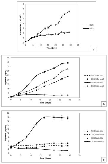The production of pigments by DSC and DSS during one month of culture was followed by biochemical quantification. For DSC, the increase in pigment concentration over the time was due to the increase in cell numbers and not to an intracellular over-accumulation as we noticed that the concentrations presented in μg/mL increased over time (Figure 1b) whereas those presented in pg/cell were almost constant (Figure 1c). Whereas for DSS, the metabolism of cells was totally oriented to carotenoid accumulation. Chlorophyll production measured in the culture (μg/mL) and on the intracellular side (μg/cell) were maintained at a basal level (Figure 1b,c). Carotenoids production in culture and intracellularly increased simultaneously (Figure 1b,c).