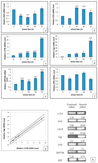 A follow-up of the expression of some genes involved in the carotene accumulation process during the first 72 h of stress time was processed by quantitative PCR. The first gene followed was ENO involved in the glycolysis cycle and giving an idea about carbon origin (polysaccharide degradation, photosynthesis, etc.) and destiny (isoprenoids synthesis, carbohydrate synthesis, etc.) in the cell. Its transcript level decreased 0.48 times during the first 24 h of stress. Then, it tended to re-stabilize after 72 h by having a relative expression level close to 1 (Figure 3a) and without a significant difference in its expression with unstressed cells (Figure 3g). On the other hand, the DXS mRNA level doubled after 24 h of stress (Figure 3b), while after 72 h, the comparison with unstressed culture showed a significant decrease in its expression level (Figure 3g).