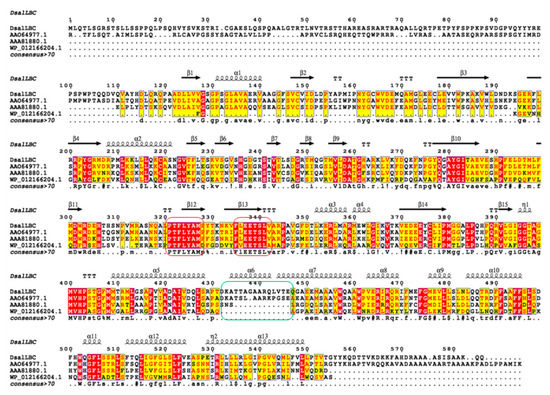 Multiple sequence alignment of LCYB from D. salina in comparison to other LCYB. The secondary structure elements of the generated 3D model indicate DsalLBC: Dunaliella salina LCYB (accession number: ACA34344.1), AAO649777.1: accession number of LCYB from Haematococcuslacustris, AAA81880.1: accession number of LCYB from Arabidopsis thaliana, WP_012166204.1: accession number of LCYB from Acaryochloris marina. Internal insertion corresponding to α6 helix is shown in a green frame, and the conserved sequences, PTFLYAM and FLEETSL, are highlighted in a red frame. Strict β-turns are presented as TT letters, and strict α-turns are shown as TTT.