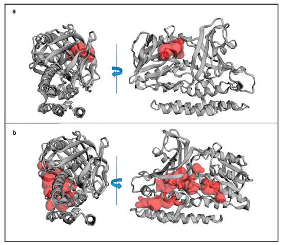 The volume (red) of the probable LCYB Flavin Adenine Dinucleotide (FAD) binding site (a) and substrate binding site (b), calculated using the CAST program.