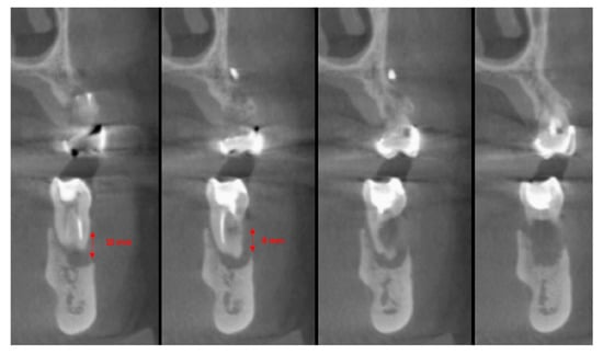 The vertical average defect was 9.16 mm, buccal lateral/palatal 7.0 mm, and mesio-distal 10.3 mm. The measurements were intraoperatively performed with a millimeter periodontal probe. The endodontic material mechanically cleaned before the tooth was placed inside the Tooth Transformer device. The endodontic material was removed using a drill bur with the attention to cut the canal in excess with the aim to remove all the cement. No surgical complications were registered. Pre and post-operative X-rays (section from CBCT) were collected from the same case (Figure 1, Figure 2, Figure 3 and Figure 4). After four months, 13 histological and histomorphometrical evaluations were performed (Figure 5). The Bone Volume/Total Volume average (BV%) was 41.47 (S.D. ± 11.51), the Residual Graft/Total Volume average (Graft%) was 16.60 (S.D. ± 7.09), and the Vital Bone/Total Bone average (VB%) was 21.89 (S.D. ± 9.72). No extraneous material (gutta-percha or cement) was detected in all samples (Table 3).