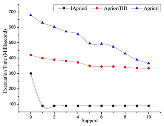 The dataset was used to test the IApriori algorithm, whereby the results were compared with those obtained from AprioriTID and Apriori. Figure 3 and Table 19 tabulate the experimental results involving dataset. The results of both IApriori and AprioriTID algorithms appeared logical and reasonable, while the outcomes retrieved from Apriori took longer time. It is emphasized here that the experimental setting was retained similar for all algorithms.