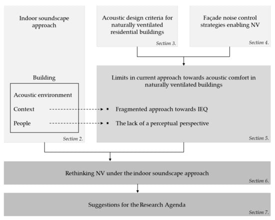 The analysis, for this paper, follows the structure which is graphically represented in Figure 1, where the sections composing the main body of this paper are indicated. Methodologically, this concept paper provides, at first, context on (i) the approach that will be applied, by briefly introducing the soundscape concept and the recent trends in indoor soundscape research and (ii) the research field where such an approach could be applied, that is, acoustic comfort in naturally ventilated residential buildings. To this aim, acoustic criteria required for naturally ventilated residential buildings are reviewed, and a summary of the façade noise control solutions developed so far to meet those criteria is provided.