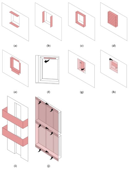 Schematic representation of passive strategies enabling natural ventilation (NV): (a) Horizontal lintels; (b) vertical fins; (c) eaves; (d) louvers or solar shadings; (e) resonators around ventilation opening; (f) trickle vents; (g) plenum window, horizontal type; (h) plenum window, vertical type; (i) balconies; and (j) double skin facades.