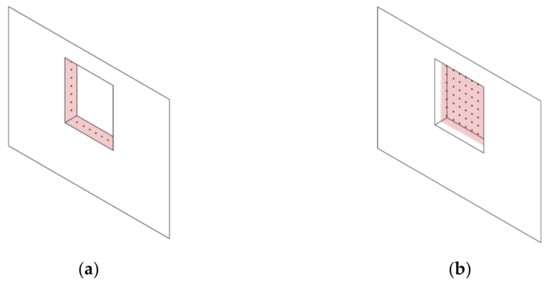 In addition to passive strategies, active noise control (ANC) solutions can be implemented in window openings to control the sound power transmitted through the aperture, thus, reducing the noise level in the indoor space (global control) or in part of it (local control). Transducers (e.g., loudspeakers) are required in the window opening to generate the so-called “anti-noise” that interferes destructively with the sound entering from the outside. Loudspeakers can be located on the boundary of the window opening or distributed over the entire aperture (see Figure 3a,b for a schematic representation). A summary of performances derived from recent studies through boundary or distributed methods is provided by Lam et al. []. The minimum number of required sources is a function of the frequency upper bound and the incident angle []. When wavelengths are large in comparison to the opening size, a smaller number of sources is required, and the boundary layout can be effective []. However, diffraction effects occur at large wavelengths, degrading the performance of boundary solutions []. Whether the boundary layout is only effective at low frequencies, for small apertures, or for local control [], the distributed layout can outperform at a cost of opening obstruction. As regards source positioning, better performances are reported with loudspeakers located in the middle of the wall width and distanced from the opening edge [].