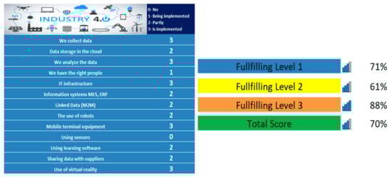 In terms of interpretation and for model purposes, the factors were identified as levels 1–3 of Industry 4.0 in the enterprises. It is clear from Table 3 that level 1 was primarily saturated with the human capital variable, collecting data, storing data in the cloud, and analyzing data. These variables have in common that they focus on working with data and the availability of human capital, i.e., the need to operate equipment and technology. Level 2, on the other hand, included all the variables related to the core infrastructure of industry 4.0. This means IT infrastructure, the presence of MES and ERP information systems, M2M-based data interconnection, the use of robots and their arms in production, mobile devices, and sensors. Level 3 included a higher level of Industry 4.0 that can be expressed through the use of learning software, data sharing with suppliers, and virtual reality. The items autonomous vehicles, additive manufacturing, nanotechnology, and drones were eliminated in the preliminary factor analysis (see Section 4.1) and not used for this run of factor analysis.