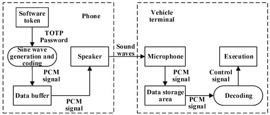 The acoustic communication model includes two parts: mobile phone and vehicle terminal. The modulation/demodulation process of acoustic communication includes software token, sine wave generation and coding, data buffer, speaker, microphone, data storage, decoding, and execution is as shown in Figure 5.