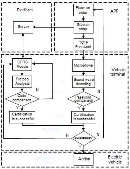 - Users use the integrated APP with the acoustic wave communication function to send instructions. Users can use the mobile phone to send the instructions of unlocking, locking, double flashing, whistling, and others. The operation instructions can be controlled in two ways: (1) using the 4G network or the 3G network of mobile phone, the instructions are sent to the platform server. After the server receives the corresponding instruction, it sends the corresponding vehicle terminal through the GPRS channel. When the GPRS module of the vehicle terminal receives the message, it parses the message protocol and judges whether the instruction is valid by comparing the code. If valid, it indicates that the certification is successful and the certification success mark is given, otherwise the fail result will be sent to the server by GPRS, and then remind users and platform managers; and (2) mobile phone speakers emit acoustic information with TOTP password. After receiving acoustic wave information from microphones, the vehicle terminal decodes the acoustic wave information, and judges whether the instruction is valid by comparing the password. If valid, it indicates that the certification is successful and the certification success mark is given, otherwise there is no operation, and uses need to place an order again. When the mark number of successfully certificating is 1 or more, by using I/O interface, the processor can realize the action control of the corresponding vehicle according to instruction information.