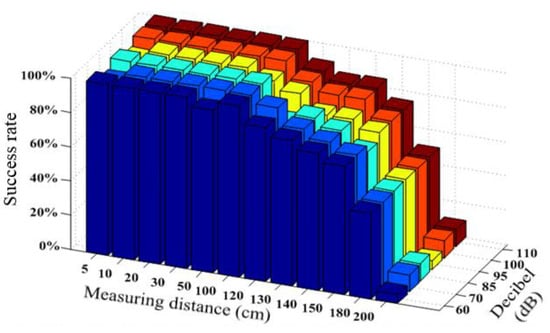 It can be seen from Figure 9 that the success rate was higher than 95% at the effective distance of 1 m with different noise. This shows that the frequency distribution and the degree of decibel in different environments were different. However, under the effect of the modulation/demodulation algorithm, the double acoustic wave enhancement algorithm and other noise reduction measurement, the influence was reduced significantly.