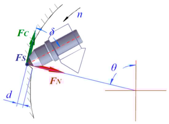 The cutter head operates with a composite motion, which includes rotating and swinging, and also through the conical tip of picks to break up the rocks. Due to the complex geological conditions in tunneling, it is very difficult to measure the cutting force imposed on the cutter head. Hence, the data obtained from the laboratory rock cutting tests with a single pick are usually used as the basis for calculating the forces of each cutter head pick. The prediction formulas of the pick forces obtained from the laboratory tests are more reasonable and reliable than those obtained in the theoretical and numerical simulation methods. In the paper, the cutting force acting on the pick is shown in Figure 1. The parameters present that d is the depth of cut, δ is the angle of attack, and n is the speed. FC is the cutting force, which is opposite to the direction of motion acting on the tip of the pick, and it is to separate the cuttings along the direction of the pick from the rock mass and forms a trough. FN is the normal force whose component force is perpendicular to the direction of motion of the coal rock, and it is to let the pick compress the rock and form the radiant point of the crack extension. Lastly, FS is the lateral force, from the normal force to the cutting direction according to the right-hand rule, and it is used to promote the rotation of the pick and forms a uniform wear.