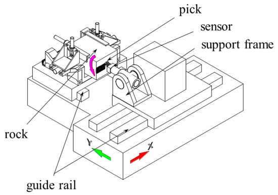 The test is performed using a full-scale rotary cutting machine, which is currently one of the most advanced single-pick rotary cutting machines, at the National Engineering Laboratory of Coal Mining Machinery and Equipment in China. This machine consists of a test platform, a control system, a test system, and data analysis software. The structure of the test platform is shown in Figure 2. The device can sensitively monitor the cutting load, vibration, temperature, and dust amount during tests. The largest size of the sample rock that it can accommodate is 1400 × 800 × 600 mm. The rock is clamped with a special fixture to prevent it from moving under large impacts. Conical picks with wolfram carbide (WC) cemented carbide pick tip are used in the test, and the parameters are that the tip diameter is 25 mm, pick angle is 80°, external elongation of the pick is 80 mm, the handle width is 34 mm, and the handle length is 78 mm. In the whole test process, the cutting speed is 1.47 m/s, the cutting depth is 4 mm, the tool spacing is 12 mm, and the strike angle is 50°. The pick was used to cut the rock from the left to right end with a total of seventy cutting cycles under the same line spacing.