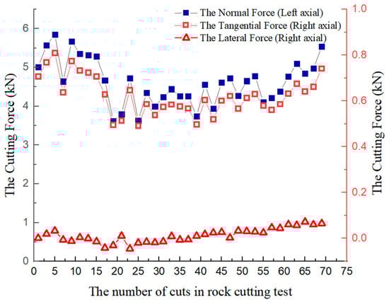Through the experiment, the normal force, the cutting force, and the lateral force from the experimental data are shown in Figure 3. It is easily found that the normal force is the largest among the components of the cutting load, the cutting force is the second, and the lateral force is the smallest. In this paper, the new pick was studied, so the first nine cutting test data were extracted to obtain the average force (Table 1). In our work, we set the normal force at 5.5 kN, the cutting force at 0.6 kN, and the lateral force at 0.002 kN.