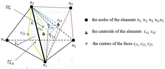 where B ¯ is the global “smoothed strain-displacement” matrix, which is due to the shape function matrix N ( x ) . For ES-FEM using the four-node tetrahedron element, as shown Figure 4, the set of nodes are {n1, n2, n3, n4, n5} for edge k. The smoothed strain-displacement matrix B ¯ I is evaluated using: