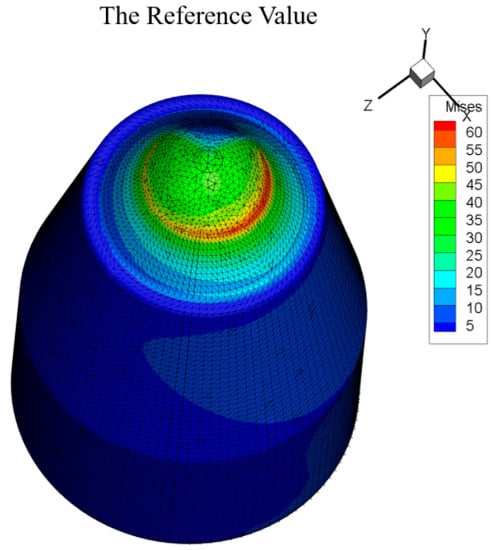 Figure 8 is the reference value of Von-Mises stress σ v using the standard FEM with 197,058 degrees of freedom. Then we plot the distribution of von-Mises stress using the present ES-FEM and FEM with the mesh having 6413 T4 elements in Figure 9. It is easily seen that the Von-Mises stress σ v distributions of the ES-FEM model are similar to that of FEM.