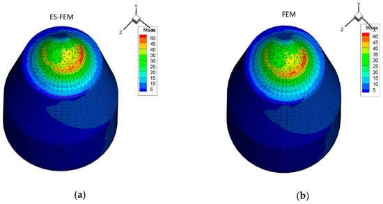 Figure 9. (a) The Von-Mises stress σ v distribution using ES-FEM; (b) The Von-Mises stress σ v distribution using FEM.