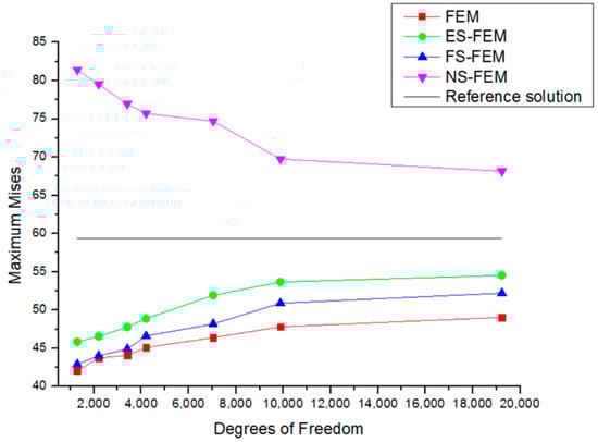 Further, we compares the maximum Von-Mises stress of ES-FEM with FEM, NS-FEM, and FS-FEM against the degrees of freedom in Figure 10. It is obviously observed that FEM is the stiffest, and ES-FEM is softened by the smoothing technique. Besides, NS-FEM still keeps the property of upper bounds. Among the results of S-FEMs and the FEM, the ES-FEM solution is the closest one to the reference solution.