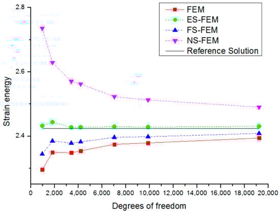 Next, in order to verify the accuracy and validity, the error norm of the strain energy of ES-FEM was calculated and compared with that of FEM, NS-FEM, and FS-FEM models. Errors of these numerical methods are analyzed using energy norms. The error norm of strain energy is calculated by: