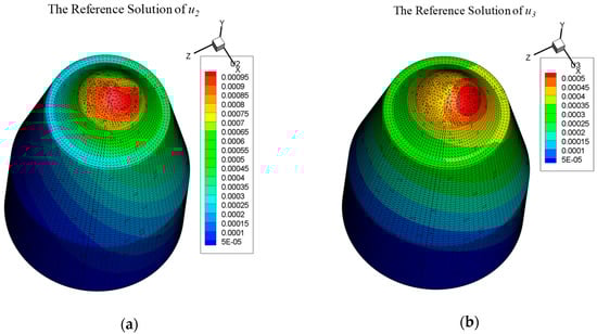 Figure 13. The reference value of nodes’ displacements along (a) the y-axis u 2 and (b) z-axis u 3 .