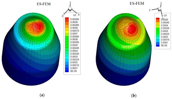 Figure 14. The approximate displacement solutions along (a) the y-axis u 2 and (b) z-axis u 3 using ES-FEM.