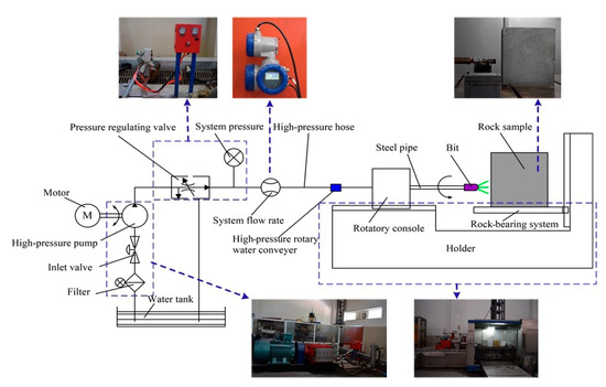 - Lu, Y.Y.; Xiao, S.X.; Ge, Z.L. Experimental study on rock-breaking performance of water jets generated by self-rotatory bit and rock failure mechanism. Powder Technol. 2019, 346, 203–216. [Google Scholar] [CrossRef]