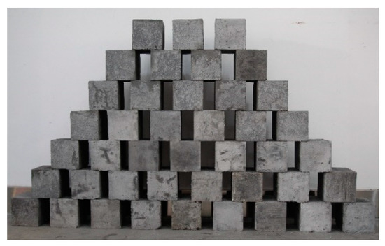 - The synthetic coal specimens used were of the same composition as those described by Gao (2016) [19]. They were molded from a mixture of cement, pulverized coal, gypsum, and water; the aggregate was 60–80 mesh coal powder, and the binder cement and gypsum. The proportions of the material were cement to gypsum to pulverized coal 32:32:17. The appropriate amount of water (water–cement ratio = 0.4) was added and the mixture was stirred until uniform and then poured into a 100 mm cubic mold for curing. This produced specimens like that shown in Figure 2. The average physical and mechanical properties of a fully cured specimen briquette were density 1498 kg/m3, compressive strength 2.45 MPa, Poisson ratio 0.19, elastic modulus 1.59 GPa, internal friction angle 26.8°, and cohesion 0.74 MPa. These properties met the experimental requirements.