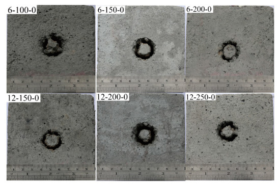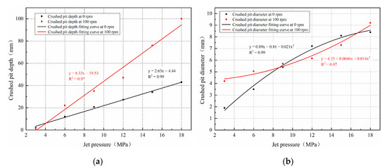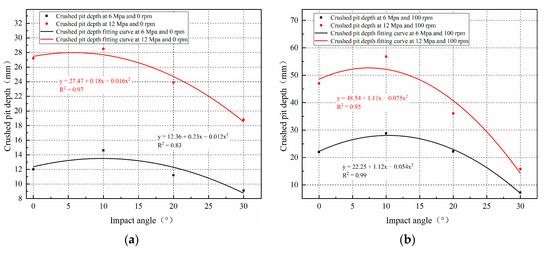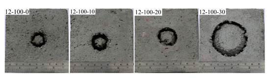 - There is an optimal jet impact angle that maximizes crushed pit depth for both rotational and fixed erosion tests. In the range examined by our experiments, an impact angle of 10° resulted in the deepest pits. The main reason for this is that the water jet eroded the rock to form a slot and there was high-pressure water in the slot. This high-pressure water acts as a “water cushion,” and when the water jet impacts the rock at a specific angle, the water cushion can reduce the jet’s reflection angle. After a groove is formed by the water jet, the flow of water is facilitated and the cuttings are washed away. However, if the impact angle is increased too much, the impact force transmitted from the jet to the rock will be reduced, resulting in decreased erosion [24,25]. Our experiments run at different flow velocities, rotation rates, and impact angles resulted in no significant change in crushed pit diameter. The diameters of the crushed pits for the 12-100-30 specimens increased by only 0.4 mm, and the diameter of the crushed pits varied by ±5%. The change was not large and may have been caused by differences in specimen strength or may have only been an apparent change caused by measurement errors.
