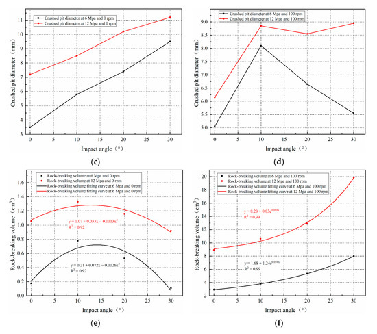 - The volume of rock broken during the rotation and fixed erosion experiments showed completely different growth modes. Under our experimental conditions the rock-breaking volume increased exponentially as impact angle increased. Although the effective rock-breaking distance exceeded the effective rock-breaking distance of the jet as the impact angle of the jet increased, the depth to which the rock was broken became significantly shallower as the impact angle increased. However, as shown in Figure 10, an oblique jet impact exerted a tensile force on the surface of the rock. The rock was rapidly damaged in an area extending radially from the jet and the radius of the crushed pit increased dramatically. This resulted in an increase in the rock-breaking area of the jet so that the rock-breaking volume by jet rotary erosion presented an exponential growth mode.