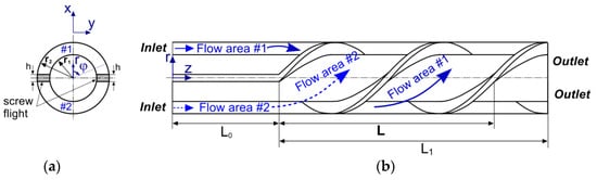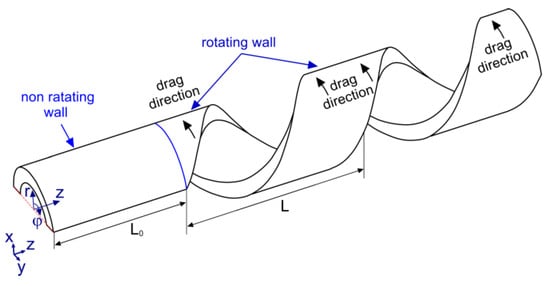 (2) The no-slip conditions of the fluid are assumed on the channel walls of straight section (L0) and on the surfaces of the screw flight and screw shaft () [,,,,];