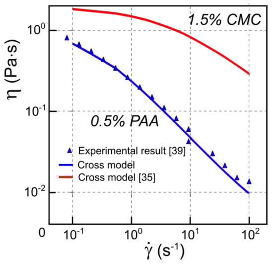 The parameters of the Cross model for 1.5% CMC and 0.5% PAA are tabulated in Table 1. The experimental data obtained from [] served as the basis for obtaining the parameters of the Cross model for 0.5% PAA.