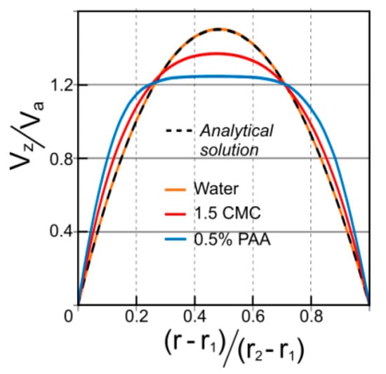 In addition, the comparison between numerical results (profile of axial velocity) and distribution (3) is performed for water flow in a coaxial channel with following parameters (Figure 7): 8D—the length of coaxial channel; = 0.039 m, = 0.026 m, = 0.05 m/s. In addition, the profiles of the axial velocity for 0.5% PAA and 1.5% CMC are shown in the same figure. For 0.5% PAA, the velocity profile is more flattened than the parabolic profile related to water. This is explained by the fact that in the near-wall region, the viscosity of 0.5% PAA is much lower than in the central part of the channel.
