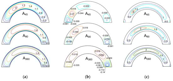Figure 8 shows the lines of equal values of the dimensionless axial (Figure 8a) and radial (Figure 8b) velocity, as well as viscosity (Figure 8c) for 0.5% PAA flow in the channel with a screw. Designations , , are cross-sections of the channel according to Figure 4. Figure 8c shows the dimensionless viscosity, which is the ratio of the actual viscosity to the average viscosity calculated in the inlet cross-section of the channel. For 0.5% PAA = 0.0509 Pa·s. As can be seen from the figure, when polymer solution flows into the curved section, provided by the presence of a screw, the velocity and viscosity profiles are rearranged. Areas with the maximum axial velocity appear at the inlet to the screw, then as the fluid flows along the channel, the velocity profile becomes more flatted. At the average velocity of 0.05 m/s, it was revealed that a steady-state flow regime is achieved in the section up to cross-section . Besides, the steady-state flow regime of 0.5% PAA is characterized by the presence of a radial velocity (up to 11%) comparable to the average velocity. This indicates the presence of radial fluid flows. At a steady-state flow, the flatted velocity profile is accompanied by the presence of an area with very high viscosity (Figure 8c) (a double exceedance of viscosity with respect to the average viscosity at the channel inlet).
