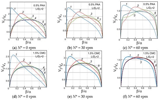 Profiles of the dimensionless axial velocity in various cross-sections of the channel (from A0 to A450) along a circle with a radius (see Figure 4) were plotted to determine the length of the initial hydrodynamic section in the channel with a screw (Figure 9). Results are presented for the case when outer pipe (barrel) is rotated with speed N* = 0, 30, 60 rpm. It was found that for 1.5% CMC, the hydrodynamic entrance length is bounded by the cross-section A180, while for 0.5% PAA, it is bounded by the cross-section . This is explained by the fact that at the same average velocity of two fluid, the corresponding Reynolds numbers differ by two orders of magnitude, namely Re (0.5% PAA) = 10.64, Re (1.5% CMC) = 0.87. It should be noted that the Reynolds number was calculated using the average viscosity () in the inlet section of the channel and the hydraulic diameter , where is the cross-sectional area of the channel, is the wetted perimeter.