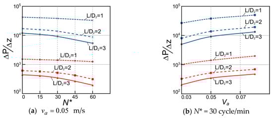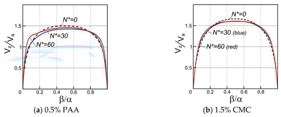 Figure 10 shows the axial velocity profiles for the steady-state flow of the studied fluids for various rotation velocities of the outer pipe (, see Figure 4). For both fluids, an increase in the outer tube rotation velocity leads to a slight deformation of the velocity profile, which is consistent with the results of the work []. It can be seen that the greatest deformation is observed for 0.5% PAA since its apparent viscosity is less than that of 1.5% CMC. It should be noted that for 0.5% PAA the axial velocity profile has the inflection point near the left screw flight caused by the rotation velocity of the outer pipe. Thus, the obtained results indicate that the outer pipe rotation makes the velocity profiles more flatted.