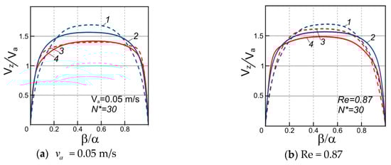 Profiles of the dimensionless axial velocity in various cross-sections of the channel (Va = 0.05 m/s): 1—, 2—, 3—, 4—, 5—, 6—, and 7— are dashed line in black.