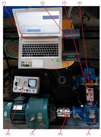 Experimental system: (1) laptop, (2) B&K data acquisition analyzer, (3) coupling, (4) acceleration sensor, (5) reducer, (6) coupling, (7) three-phase induction motor, and (8) electromagnetic speed control motor controller.