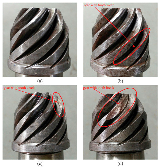 (a) Normal gear, (b) gear with tooth wear, (c) gear with tooth crack, and (d) gear with tooth break.