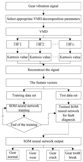 Noise will inevitably be introduced in the process of gear vibration signal acquisition, which will cause adverse impact on fault diagnosis. Therefore, this paper proposes a method based on kurtosis criterion VMD and SOM neural network for gear fault diagnosis and identification. Fault diagnosis flow chart is shown in Figure 3: