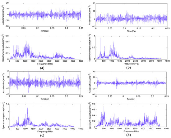 The time-domain and frequency-domain diagrams of vibration signals collected under four working conditions of normal gear, gear with tooth wear, gear with tooth crack, and gear with tooth break are shown in Figure 4.