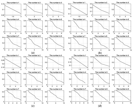 The instantaneous frequency mean of gear vibration signal at the decomposition number of 1–9: (a) Normal gear vibration signal, (b) gear with tooth wear vibration signal, (c) gear with tooth crack vibration signal, and (d) gear with tooth break vibration signal.