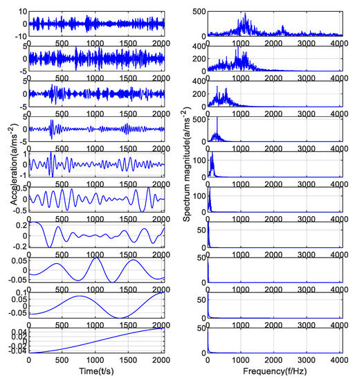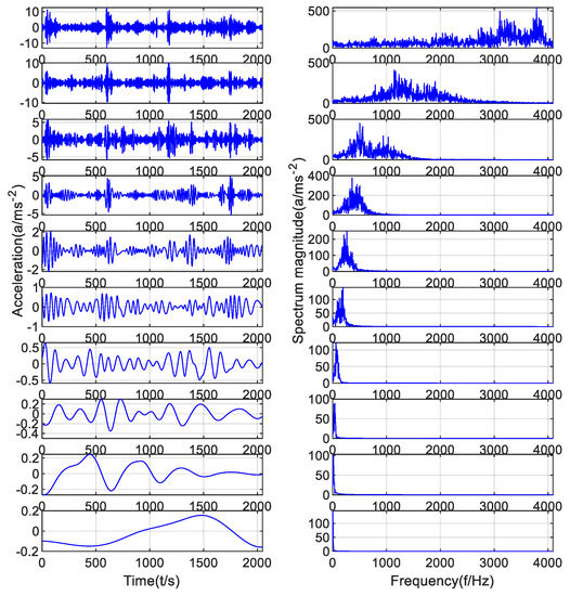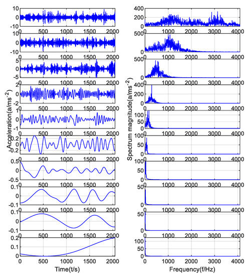 It can be seen from Figure 8 that the frequency of the main fault signal can be obtained after EMD decomposition of the simulation signal. However, it can be seen from the frequency-domain diagram of IMF4 that it has mode mixing with IMF3 and IMF2, indicating that the component signal with characteristic frequency also exists in the component signals of IMF3 and IMF2. At the same time, the endpoint effect occurred at the left endpoint of the time-domain diagram of IMF4 in the EMD decomposition diagram, and its value was 0, which would have a bad effect on the Fourier transform of the component signal.