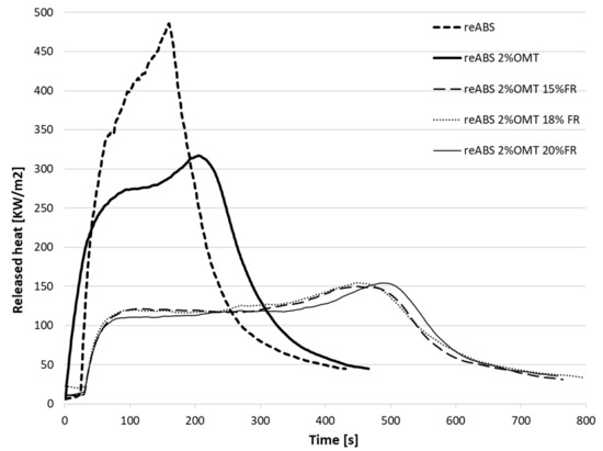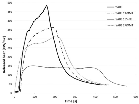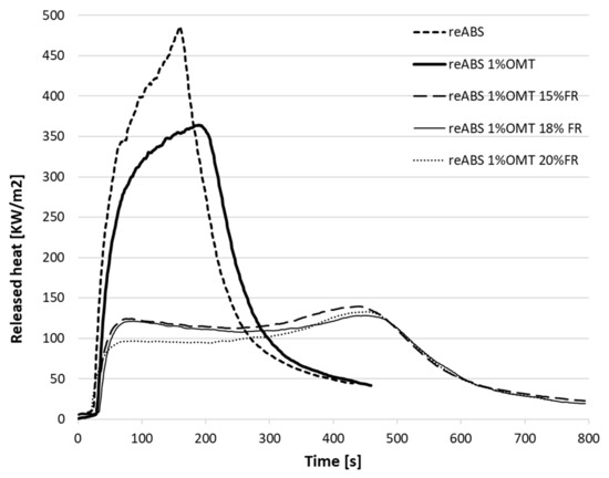 Released heat against time for reABS (recycled acrylonitrile-butadiene-styrene) and reABS with fire retardant (FR) and organic montmorillonite (OMT).