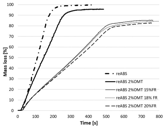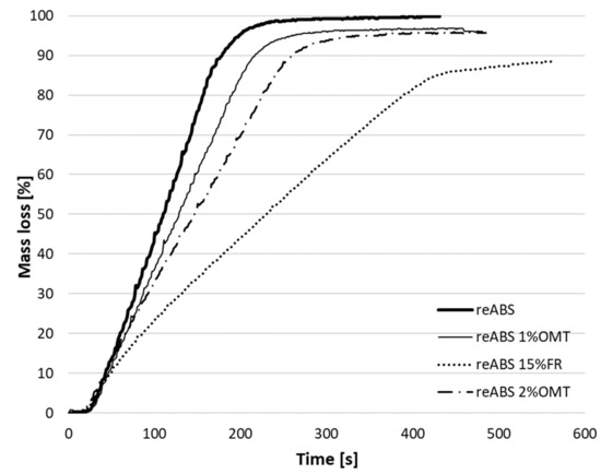 These results are in line with the outcomes of Realinho et al. [1] (i.e., a mass loss of 87.7% when 25% FR is added to pristine ABS). However, the influence of 1%–2% OMT is rather limited. Similar details are shown in Figure 5 and Figure 6, where it can be clearly seen that the addition of FR greatly influences the mass loss reduction. More precisely, the decomposition time increases around 10% and 20% after adding 1% and 2% OMT, respectively, but when FR is added an increase of 200% is achieved in terms of decomposition time and 89.3% of the mass loss. In this case the mass loss is related to the released heat and fire propagation, as Gilman et al. [12] revealed in their study of materials with OMT and different fire retardants. Table 5 summarizes the results obtained from the figures for different times (after 100, 200, and 300 s), in order to evaluate the influence of OMT and FR on the reABS polymer.