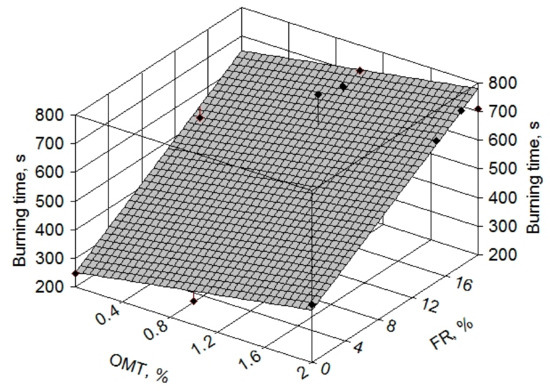 Finally, another important parameter derived from the con-calorimeter test is the burning time that reflects the time needed for a specific material to decompose and to generate the volatile materials that sustain the burning process. Figure 7 presents the regression analysis of the experimental results where the influence on burning time of both the fire retardant and OMT concentration are evident. It can be seen that the influence of FR is bigger than that of OMT, although the best performance is obtained for reABS + OMT + FR (an increase of the burning time up to 30 times). In order to predict the total burning time for the different architectures studied, a regression was found with regard to Figure 7 (see the surface fit) and the following equation was obtained: