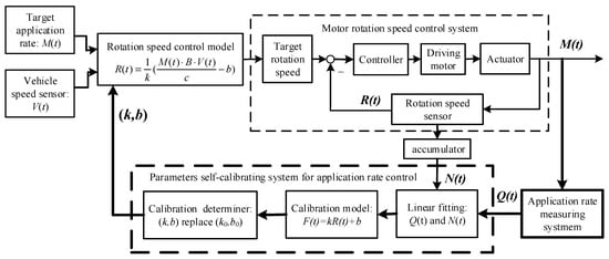In general, the application rate control was realized using the strategy described in Figure 1. It was essentially an open-looped method because there was no feedback data for updating parameters k and b. k and b were the parameters of the control model expressed as Equation (3). The value of the parameters (k and b) varied with the increase of usage time or changes in working conditions. If there was no effective device to sense the change of the model parameters, the fluted-roller rotation speed calculated from Equation (3) deviated the actual control target and caused a control error. Therefore, in order to maintain excellent control performance, effective methods were needed to sense the change of k and b and dynamically adjust the control model parameters.
